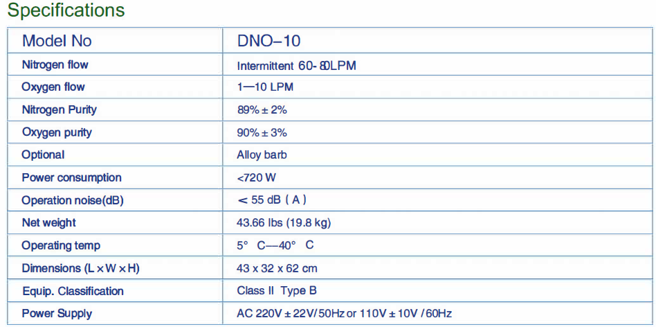 SPECIFICATIONS FOR DYNMED 10L Low OXYGEN CONCENTRATOR
